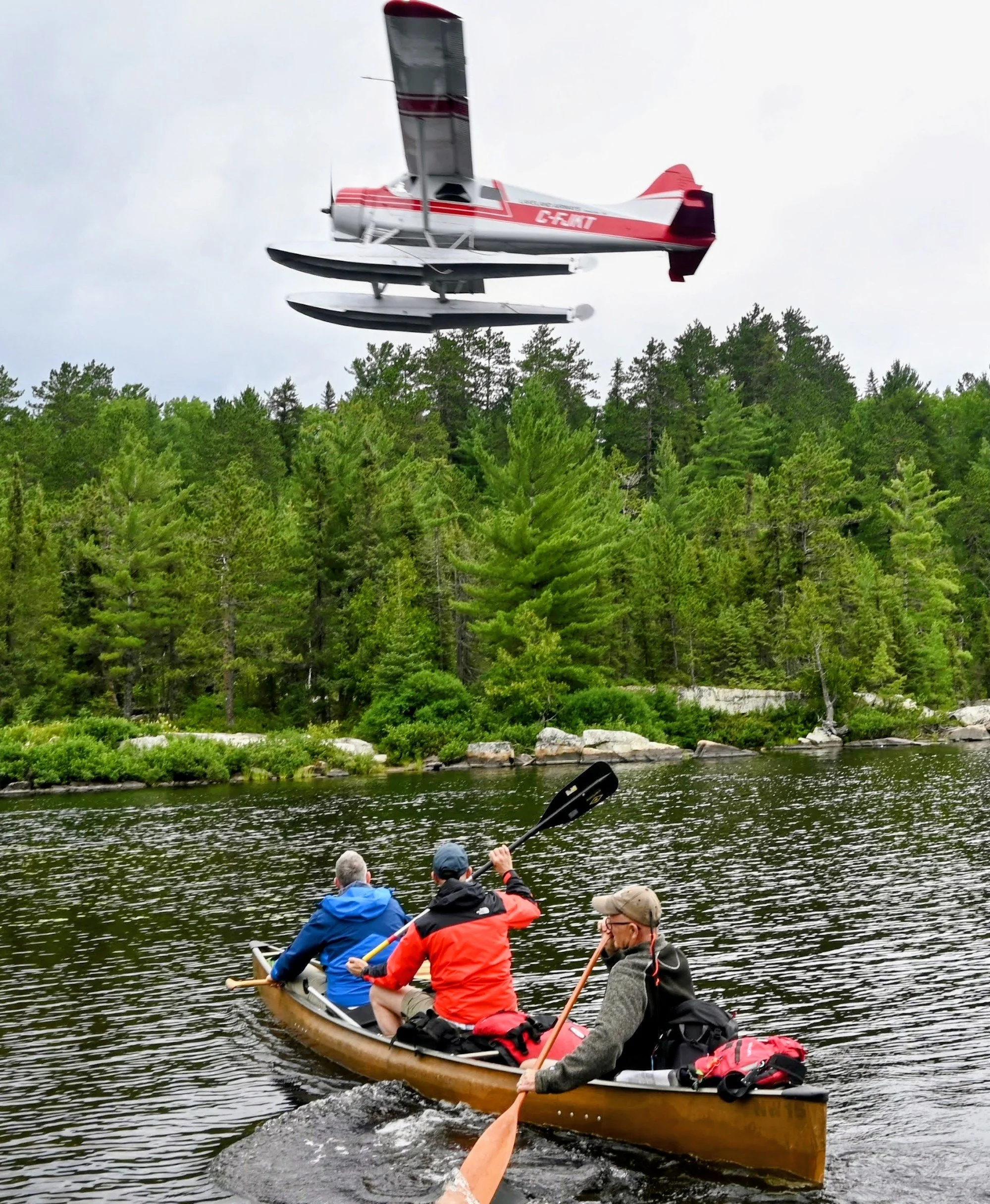 From front to back of canoe: Rev. David A. Dubbeldam (husband), David B. Devan (me), and Dan M. Clarke (canoe buddy for 30 years) in Temagami Wilderness Area. Float plan drop off provided by Lakeland Airways Ltd.